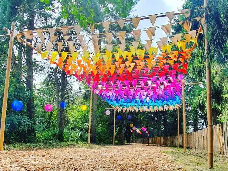 • Schaduw & Geborgenheid: Kleed de tunnel aan met stretchdoeken of legernetten voor een beschutte, intieme route.
